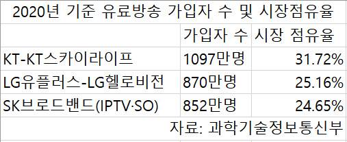 통신3사가 '3강 구도'를 형성하고 있는 국내 유료방송 시장구도에도 변화가 예고되고 있다. 과학기술정보통신부에 따르면, 지난해 말 기준 KT그룹(KT스카이라이프 포함)의 유료방송 점유율은 31.7%(1097만명), LG유플러스(LG헬로비전 포함)는 25.2%(870만명), SK브로드밴드는 24.7%(852만명)를 기록하고 있다. LG유플러스로서는 이번 디즈니플러스와의 제휴로, 1위 사업자인 KT를 더 바짝 추격하고, 3위 사업자인 SK브로드밴드와의 격차를 더 벌이겠다는 구상이다.