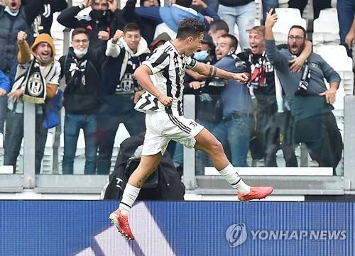 epa09489422 Juventus? Paulo Dybala celebrates scoring the opening goal during the Italian Serie A soccer match Juventus FC vs UC Sampdoria at Allianz Stadium in Turin, Italy, 26 September 2021. EPA/ALESSANDRO DI MARCO