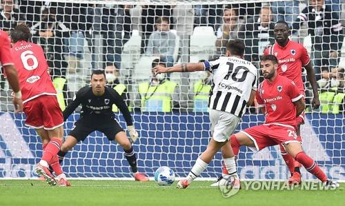 epa09489424 Juventus? Paulo Dybala (C) scores the opening goal during the Italian Serie A soccer match Juventus FC vs UC Sampdoria at Allianz Stadium in Turin, Italy, 26 September 2021. EPA/ALESSANDRO DI MARCO