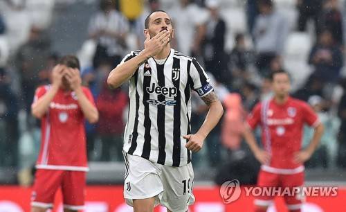 epa09489450 Juventus? Leonardo Bonucci celebrates scoring the 2-0 lead during the Italian Serie A soccer match Juventus FC vs UC Sampdoria at Allianz Stadium in Turin, Italy, 26 September 2021. EPA/ALESSANDRO DI MARCO