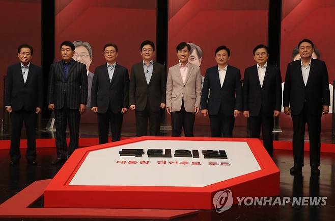 (서울=연합뉴스) 국민의힘 윤석열(오른쪽 부터), 황교안, 원희룡, 하태경, 유승민, 최재형, 안상수, 홍준표 대선 경선 후보들이 26일 서울 마포구 상암동 채널A 스튜디오에서 열린 국민의힘 제20대 대통령 경선후보 3차 방송토론회에 앞서 기념촬영을 하고 있다. 2021.9.26 [국회사진기자단]