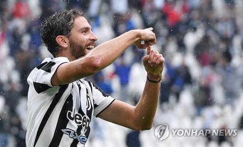 epa09489543 Juventus? Manuel Locatelli celebrates after scoring the 3-1 goal during the Italian Serie A soccer match Juventus FC vs UC Sampdoria in Turin, Italy, 26 September 2021. EPA/ALESSANDRO DI MARCO