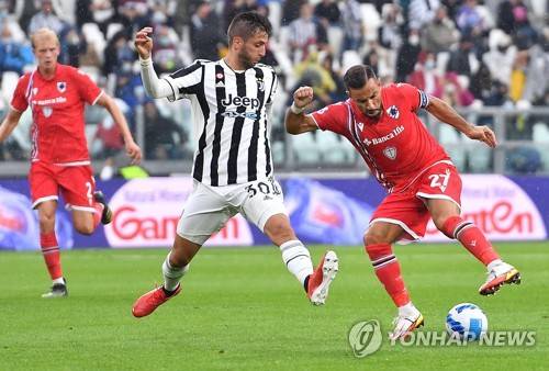 epa09489541 Juventus? Rodrigo Bentancur and Sampdoria?s Fabiop Quagliarella in action during the Italian Serie A soccer match Juventus FC vs UC Sampdoria in Turin, Italy, 26 September 2021. EPA/ALESSANDRO DI MARCO