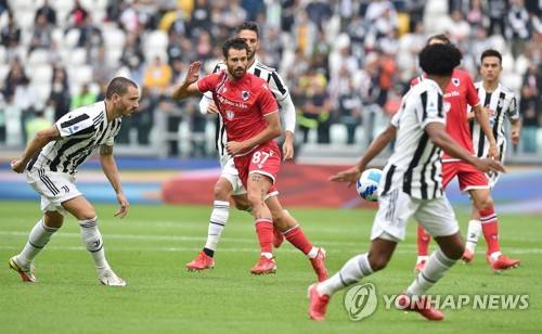 epa09489542 Juventus? Leonardo Bonucci and Sampdoria?s Antonio Candreva in action during the Italian Serie A soccer match Juventus FC vs UC Sampdoria in Turin, Italy, 26 September 2021. EPA/ALESSANDRO DI MARCO