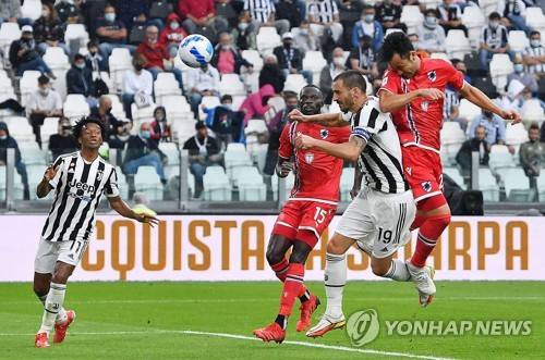 epa09489548 Sampdoria Maya Yoshida (R) score the 2-1 goal during the Italian Serie A soccer match Juventus FC vs UC Sampdoria in Turin, Italy, 26 September 2021. EPA/ALESSANDRO DI MARCO