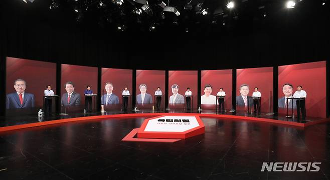 [서울=뉴시스] 국회사진기자단 = 국민의힘 대선 경선 예비후보들이 26일 서울 상암동 채널A 스튜디오에서 열린 방송토론회 준비를 하고 있다. 2021.09.26. photo@newsis.com