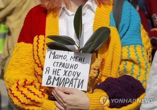 epa09489564 An activist holding a plant with a placard reading 'Mommy, I'm afraid, I don't want to die' takes part in a 'Climate March' in Kiev, Ukraine, 26 September 2021. Protesters demonstrated in the capital Kiev to draw the attention of Ukrainian officials on the issue of climate change and demanding action. EPA/SERGEY DOLZHENKO