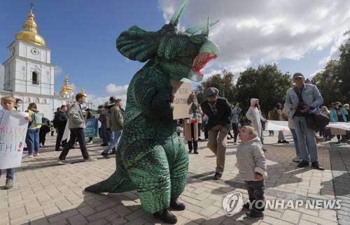 epa09489561 An environmental protester wearing a costume of a dinosaur takes part in a 'Climate March' in Kiev, Ukraine, 26 September 2021. Protesters demonstrated in the capital Kiev to draw the attention of Ukrainian officials on the issue of climate change and demanding action. EPA/SERGEY DOLZHENKO