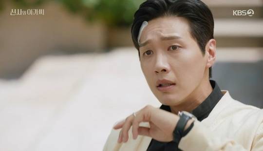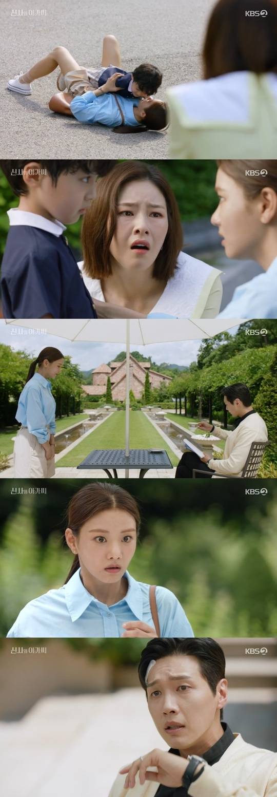박단단은 이영국의 집으로 면접을 보러 가는 길 차에 치일 뻔한 막내 아들 이세종(서우진 분)을 구하고 무릎을 다쳤고, 곧 박단단과 이영국이 면접에서 서로를 알아보고 경악했다. (사진=KBS 2TV ‘신사와 아가씨’ 캡처)