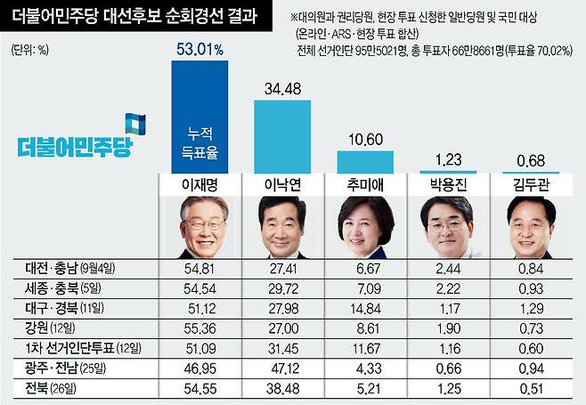 더불어민주당 순회경선의 최대 관심사였던 호남 경선은 이재명 후보의 승리로 26일 마무리됐다. 이 후보는 전날 광주·전남 경선에서 이낙연 후보에게 처음으로 1위를 내줬으나, 이날 전북 경선에서는 54.55%로 압승을 거두며 승기를 굳혔다. 이재명 후보가 누적 득표에서 12만표 가까이 이낙연 후보를 앞서고 있어 ‘대세론’이 쉽게 꺾이지 않을 것이라는 전망이 많지만, ‘대장동 의혹’의 전개 여부에 따라 표심에 영향을 미칠 수 있다는 의견도 있다.