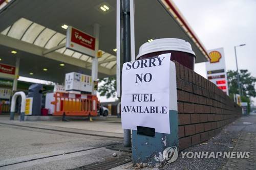 A view of a sign at a petrol station, in Bracknell England, Sunday Sept. 26, 2021. In a U-turn, Britain says it will issue thousands of emergency visas to foreign truck drivers to help fix supply-chain problems that have caused empty supermarket shelves, long lines at gas stations and shuttered petrol pumps. (Steve Parsons/PA via AP) UNITED KINGDOM OUT NO SALES NO ARCHIVE PHOTOGRAPH CANNOT BE STORED OR USED FOR MORE THAN 14 DAYS AFTER THE DAY OF TRANSMISSION