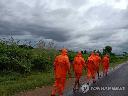 This Photograph provided by India's National Disaster Response Force (NDRF) shows NDRF personnel arriving in preparation for Cyclone Gulab, that likely to make landfall on Sunday evening at Ganjam, eastern Odisha state, India, Sunday, Sept.26, 2021. (National Disaster Response Force via AP) AP PROVIDES ACCESS TO THIS THIRD PARTY PHOTO SOLELY TO ILLUSTRATE NEWS REPORTING OR COMMENTARY ON FACTS DEPICTED IN IMAGE; MUST BE USED WITHIN 14 DAYS FROM TRANSMISSION; NO ARCHIVING; NO LICENSING; MANDATORY CREDIT