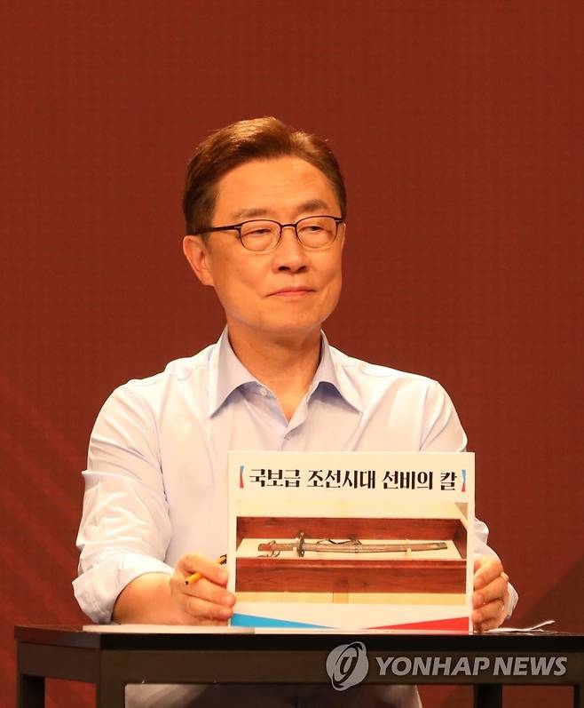 (서울=연합뉴스) 국민의힘 최재형 대선 경선 후보가 26일 서울 마포구 상암동 채널A 스튜디오에서 열린 국민의힘 제20대 대통령 경선후보 3차 방송토론회에서 준비한 '국보급 조선시대 선비의 칼' 사진을 보여주고 있다. 2021.9.26 [국회사진기자단]