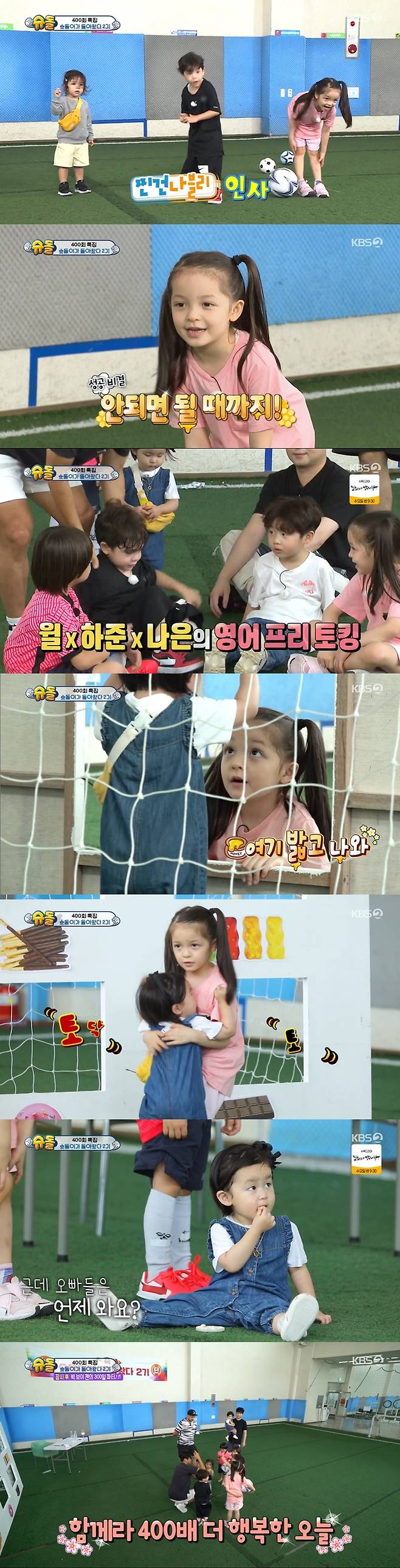 나은이는 "태권도를 잘한다"며 호쾌하게 발차기 시범을 보였다. 발차기로 격판도 부셨다. 박주호는 아이들과 골을 넣으면 간식을 먹을 수 있는 게임을 시작했다.