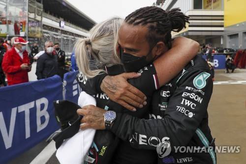 epa09489727 British Formula One driver Lewis Hamilton of Mercedes-AMG Petronas celebrates after winning the 2021 Formula One Grand Prix of Russia at the Sochi Autodrom race track in Sochi, Russia, 26 September 2021. EPA/Yuri Kochetkov / POOL