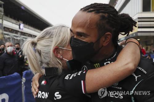 epa09489733 British Formula One driver Lewis Hamilton of Mercedes-AMG Petronas celebrates after winning the 2021 Formula One Grand Prix of Russia at the Sochi Autodrom race track in Sochi, Russia, 26 September 2021. EPA/Yuri Kochetkov / POOL