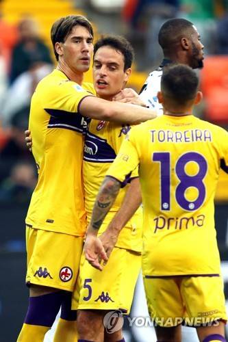 epa09489743 Fiorentina's Dusan Vlahovic (L) celebrates with teammate Giacomo Bonaventura (C) after scoring the 1-0 lead from the penalty spot during the Italian Serie A soccer match between Udinese Calcio and ACF Fiorentina in Udine, Italy, 26 September 2021. EPA/GABRIELE MENIS
