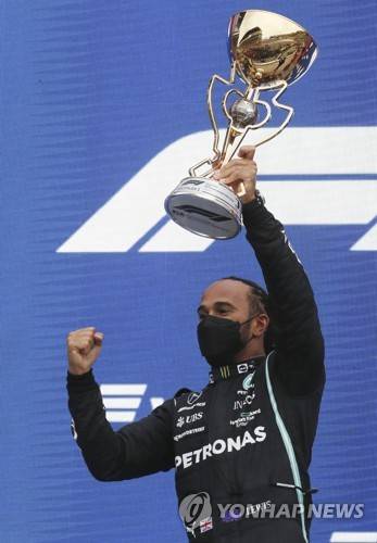 epa09489758 British Formula One driver Lewis Hamilton of Mercedes-AMG Petronas celebrates on the podium after the 2021 Formula One Grand Prix of Russia at the Sochi Autodrom race track in Sochi, Russia, 26 September 2021. EPA/Yuri Kochetkov / POOL
