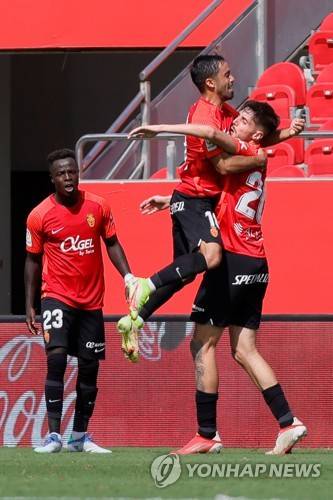 epa09489761 RCD Mallorca's striker Fer Nino (R) celebrates with his teammates after scoring a goal during the Spanish LaLiga soccer match between RCD Mallorca and Osasuna at Son Moix stadium in Palma de Mallorca, Spain, 26 September 2021. EPA/Cati Cladera
