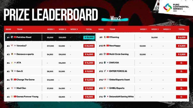 이번 2주차는 1일차에서 2치킨을 낚은 ATA가 2일차에서 부진을 겪으면서 혼돈에 빠졌다. ATA가 치킨을 추가하지 못하는 사이 본격적으로 추격을 개시한 팀은 2팀이다. 치킨 수는 부족하지만 2치킨을 달성한 한국의 다나와와 4, 5라운드 연속 치킨으로 기세를 끌어올린 페트리코 로드가 우승 후보로 부상했다.