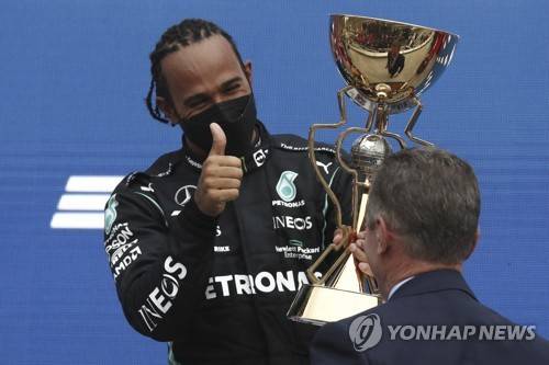 epa09489771 British Formula One driver Lewis Hamilton (L) of Mercedes-AMG Petronas celebrates on the podium after the 2021 Formula One Grand Prix of Russia at the Sochi Autodrom race track in Sochi, Russia, 26 September 2021. EPA/Yuri Kochetkov / POOL