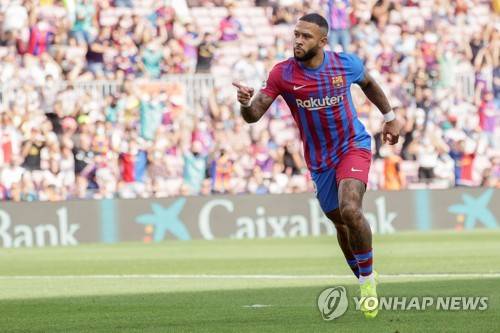 epa09489798 Barcelona's striker Memphis Depay celebrates after scoring the 1-0 from the penalty spot during the Spanish LaLiga soccer match between FC Barcelona and Levante UD at Camp Nou stadium in Barcelona, Catalonia, Spain, 26 September 2021. EPA/Quique Garcia