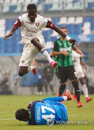 epa09489812 Sassuolo's goalkeeper Andrea Consigli (bottom) clears from Salernitana's Mamadou Coulibaly (up) during the Italian Serie A soccer match between US Sassuolo Calcio and US Salernitana in Reggio Emilia, Italy, 26 September 2021. EPA/ELISABETTA BARACCHI