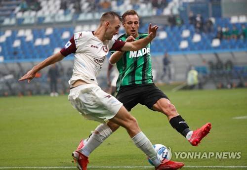 epa09489813 Sassuolo's Davide Frattesi (R) and Salernitana's Norbert Gyomber (L) in action during the Italian Serie A soccer match between US Sassuolo Calcio and US Salernitana in Reggio Emilia, Italy, 26 September 2021. EPA/ELISABETTA BARACCHI