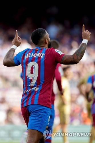 epa09489814 Barcelona's striker Memphis Depay celebrates after scoring the 1-0 from the penalty spot during the Spanish LaLiga soccer match between FC Barcelona and Levante UD at Camp Nou stadium in Barcelona, Catalonia, Spain, 26 September 2021. EPA/Quique Garcia
