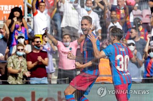 epa09489815 Barcelona's striker Luuk De Jong (L) celebrates after scoring the 2-0 goal during the Spanish LaLiga soccer match between FC Barcelona and Levante UD at Camp Nou stadium in Barcelona, Catalonia, Spain, 26 September 2021. EPA/Quique Garcia