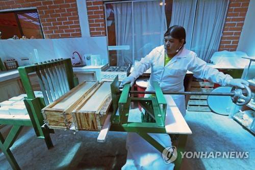 epa09489914 Bolivian, indigenous Aymara people, an industrial chemist Silveria Cutipa shows a tool for making soaps in her laboratory during an interview in Bajo Pampahasi, La Paz, Bolivia, 18 September 2021 (issued 26 September 2021). Chemistry, innovation and caring for the environment are the passion of the Bolivian Silveria Cutipa, an Aymara professional, who recycles oil from fried foods to make artisan soap in a venture with which she also revalues the use of traditional and medicinal plants. Cutipa works in the small laboratory in which she also makes soaps and detergents. EPA/MARTIN ALIPAZ