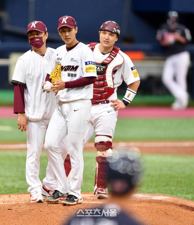 키움 선발 김동혁이 26일 2021프로야구 키움 히어로즈와 롯데 자이언트의 경기 3회초 2사 1,2루에서 강판되고 있다. 2021.09.26.
