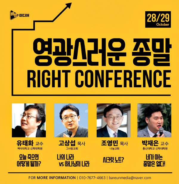 바른미디어는 한국교회 성도들과 건강한 종말론을 논의하는 ‘라이트 콘퍼런스(Right conference)’(포스터)를 연다.