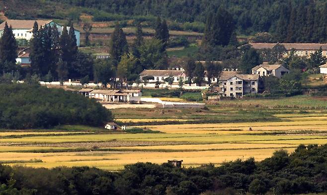 | 노랗게 물든 北 들녘 가을 추수철을 앞둔 26일 경기 파주시 오두산 통일전망대에서 바라본 북한 황해북도 개풍군 들녘이 노랗게 물들어 있다. 김여정 북한 노동당 부부장은 전날까지 이틀 연속 남북관계와 관련해 남북공동연락사무소 재설치, 남북정상회담 가능성까지 거론하는 담화를 발표했다. 파주=이재문 기자 |