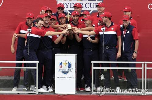 epa09490638 The US team celebrates with the Ryder Cup trophy after winning on the final day of the pandemic-delayed 2020 Ryder Cup golf tournament at the Whistling Straits golf course in Kohler, Wisconsin, USA, 26 September 2021. EPA/TANNEN MAURY