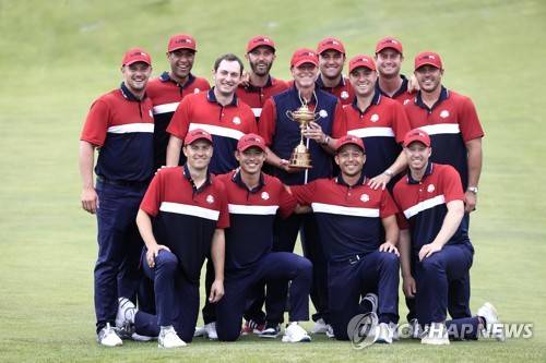 epa09490655 The US team celebrates with the Ryder Cup trophy after winning on the final day of the pandemic-delayed 2020 Ryder Cup golf tournament at the Whistling Straits golf course in Kohler, Wisconsin, USA, 26 September 2021. EPA/TANNEN MAURY