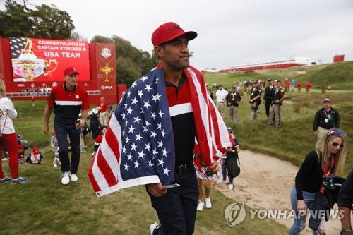 epa09490659 The US team's Tony Finau as the team celebrates with the Ryder Cup trophy after winning on the final day of the pandemic-delayed 2020 Ryder Cup golf tournament at the Whistling Straits golf course in Kohler, Wisconsin, USA, 26 September 2021. EPA/TANNEN MAURY