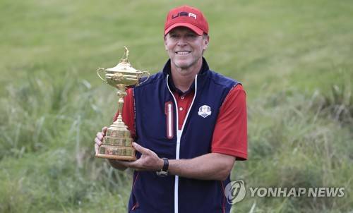 epa09490661 The US team captain Steve Stricker celebrates with the Ryder Cup trophy after winning on the final day of the pandemic-delayed 2020 Ryder Cup golf tournament at the Whistling Straits golf course in Kohler, Wisconsin, USA, 26 September 2021. EPA/TANNEN MAURY