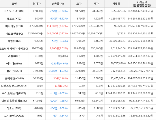 또한, 폴카닷(-4.53%, 34,990원), 테조스(-4.42%, 8,000원), 도지코인(-2.34%, 250원), 아이오에스티(-2.07%, 71.1원), 이오스(-2.03%, 4,820원), 이더리움클래식(-1.58%, 57,340원), 코스모스(-1.24%, 47,880원), 세럼(-0.54%, 9,205원)이 하락세를 나타냈다.