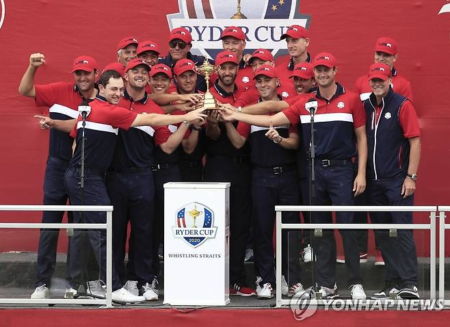 26일(현지시간) 미국 위스콘신주 헤이븐의 휘슬링 스트레이츠에서 열린 미국과 유럽의 남자 골프 대항전 제43회 라이더컵 골프대회에서 우승한 미국 선수단이 트로피를 든 채 환호하고 있다.