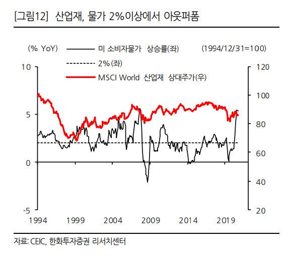 박승영 한화투자증권 연구원은 "글로벌 경기의 뚜렷한 방향을 예측하기 어려운데, 이때 지금의 높은 인플레는 일시적이지만 인플레 기대는 2%에 묶일 것이고 금리 인상을 준비 중인 연방준비제도(Fed·연준)의 스탠스를 투자에 녹인다면 산업재가 교집합이 될 수 있다"며 "이튼(Eaton), 일리노이 툴웍스(Illinois toolworks) 등 미국의 전력장비 기업들의 주가도 견조한 등 미국 투자에 기대 볼만하다는 생각"이라고 전했다.