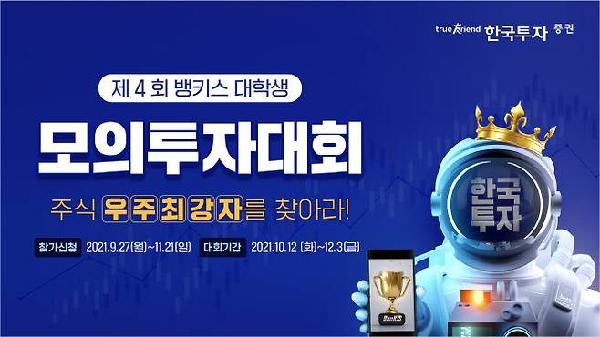 한국투자증권은 건전한 투자문화 정착을 위해 대학생 및 대학원생을 대상으로 '제4회 뱅키스 대학생 모의투자대회'를 개최한다고 27일 밝혔다.