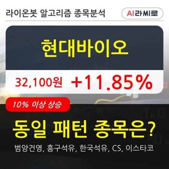 이 시각 거래소에서 현대바이오 이외에도 범양건영(10.0%), 흥구석유(10.78%), 한국석유(12.35%), CS(17.57%), 이스타코(12.12%) 등이 상승세를 보이고 있다.