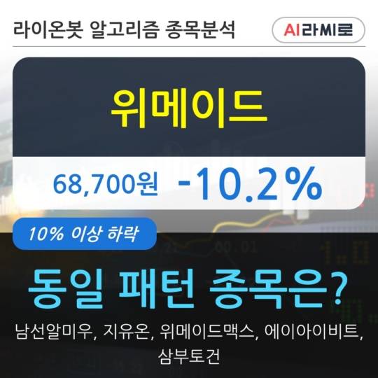 이 시각 거래소에서 위메이드 이외에도 남선알미우(-13.43%), 지유온(-23.64%), 위메이드맥스(-10.34%), 에이아이비트(-18.39%), 삼부토건(-16.56%) 등이 하락세를 보이고 있다.