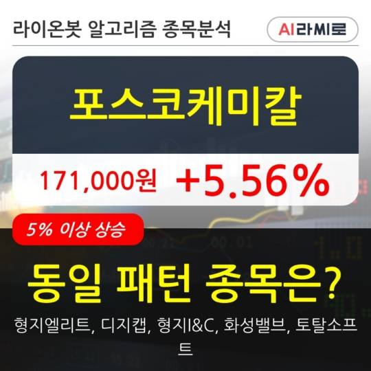 이 시각 거래소에서 포스코케미칼 이외에도 형지엘리트(8.5%), 디지캡(6.09%), 형지I &C(6.93%), 화성밸브(7.6%), 토탈소프트(11.81%) 등이 상승세를 보이고 있다.