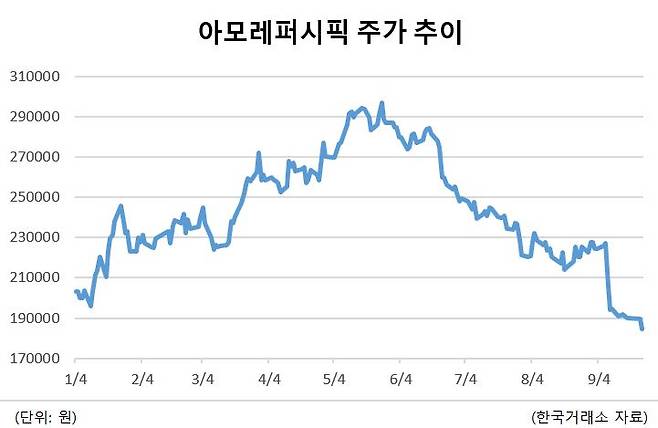27일 한국거래소에 따르면 아모레퍼시픽 주가는 추락세를 면치 못하고 있다. 지난 5월 30만원까지 치솟았던 주가는 지난 24일 기준 18만원대에서 거래되고 있다. 약 4개월 새 40% 가까이 폭락한 셈이다.