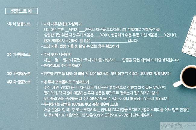 유튜브나 오프라인 강의를 진행하면서 아쉬웠던 건, 가장 중요한 '실행’은 강의를 들은 후 개개인에게 달려 있다는 점이었어요. 제가 일일이 구독자나 사람들을 코치하는 것도 한계가 있고요. 막 취업한 동생에게 코치해줬던 내용들을 행동노트로 만들어서 이번 책에 주 차별로 정리해 넣었어요. 재테크에서 가장 중요한 건 실행이 아닐까요. 실행하고자 하는 행동들을 정리하고 그 액션을 다 따라 했다면 그것만으로도 큰 성공이라고 생각합니다.
