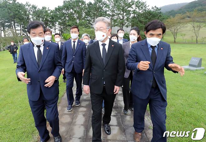 (제주=뉴스1) 오현지 기자 = 더불어민주당 대권 주자인 이재명 경기도지사가 27일 오전 제주시 봉개동 제주4·3평화공원 행불인 표지석을 찾아 설명을 듣고 있다. 2021.9.27/뉴스1