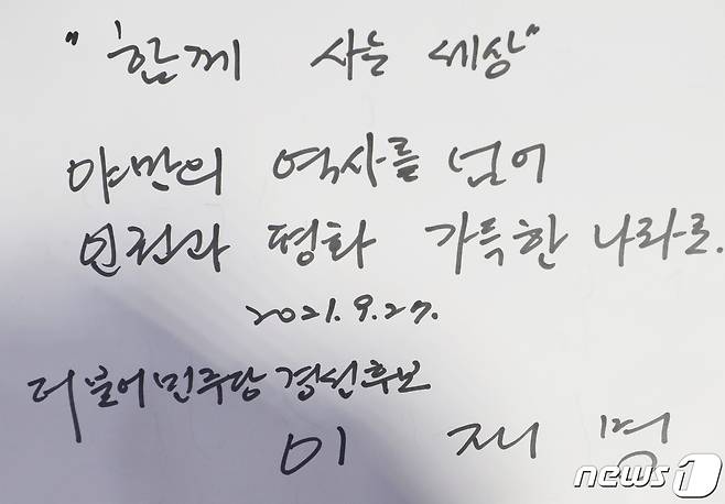 이 지사는 이날 방명록에 '함께 사는 세상, 야만의 역사를 넘어 인권과 평화 가득한 나라로'라고 썼다. 2021.9.27/뉴스1