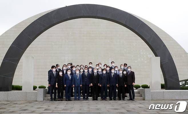 (제주=뉴스1) 오현지 기자 = 더불어민주당 대권 주자인 이재명 경기도지사가 27일 오전 제주시 봉개동 제주4·3평화공원 참배를 마치고 기념사진을 찍고 있다. 2021.9.27/뉴스1